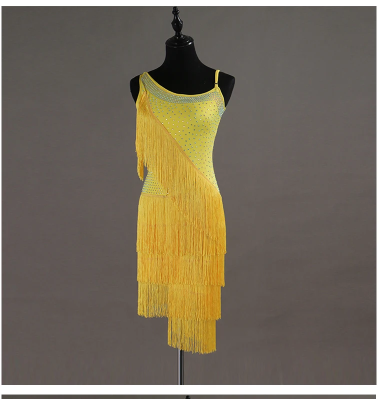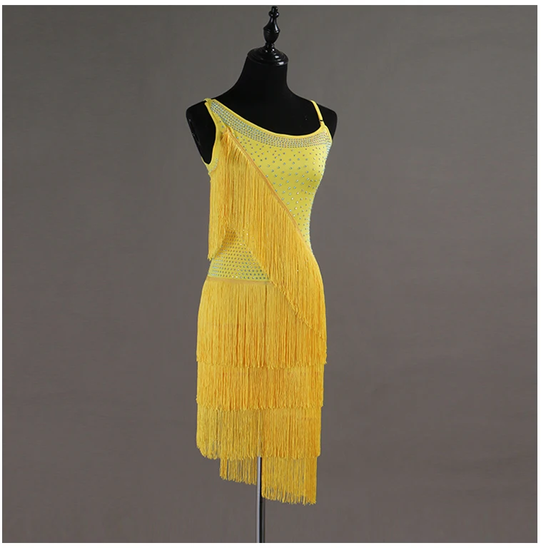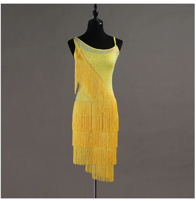 BEST Shiny Rhinestone Latin Dance Dresses For Women Yellow Lace Fringe Skirt Club Party Dancer Singer En